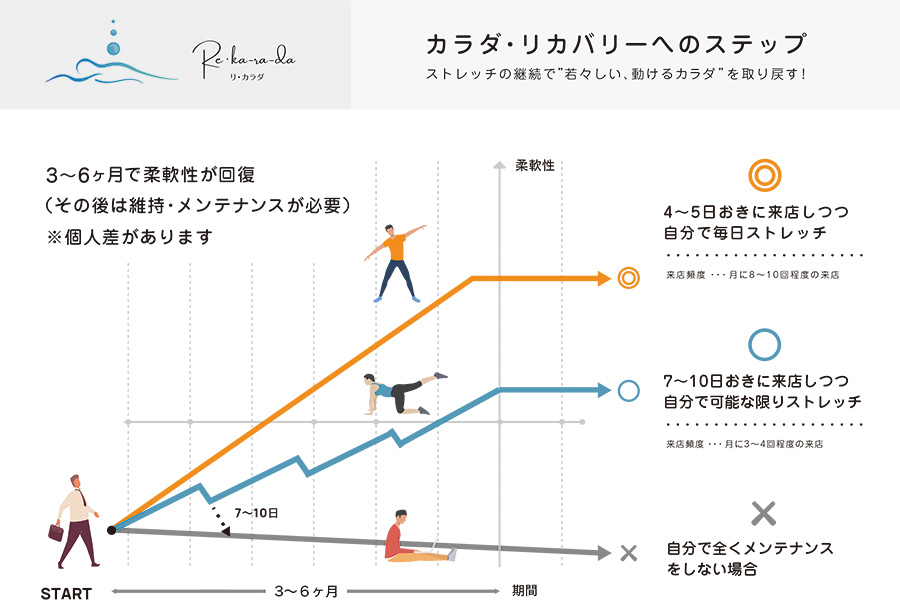 7~10日おきに来店していただき、 こ自分でも可能な限りストレッチをする習慣を身に付けると、 ”若々しい、 動けるカラダを保つことができますよ!