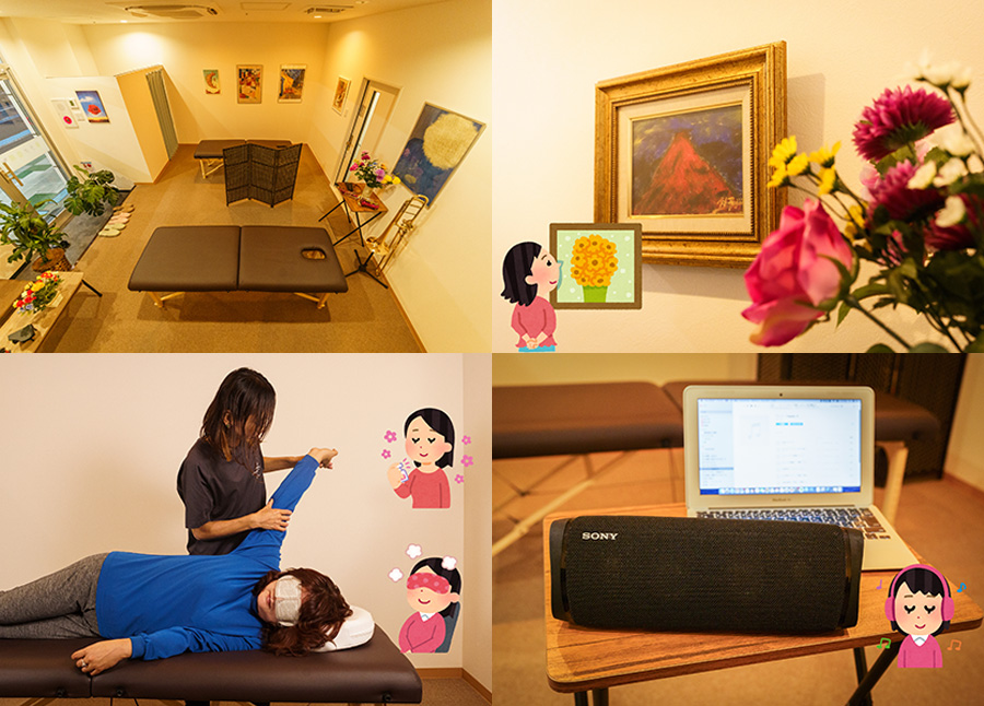 音楽は、オーナー作曲オリジナルのほか、自律神経を整える高周波数を多く含んでいるモーツァルトの曲、癒しやリラックス効果があると言われる「1/f ゆらぎ」(エフぶんのいちゆらぎ)の自然音を含んだバッハの曲などを施術中のBGMに使用します。