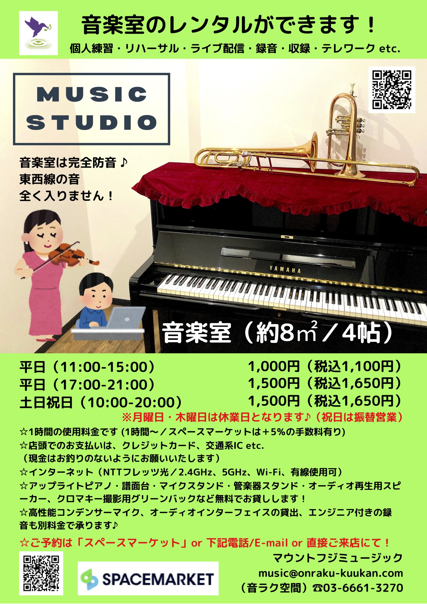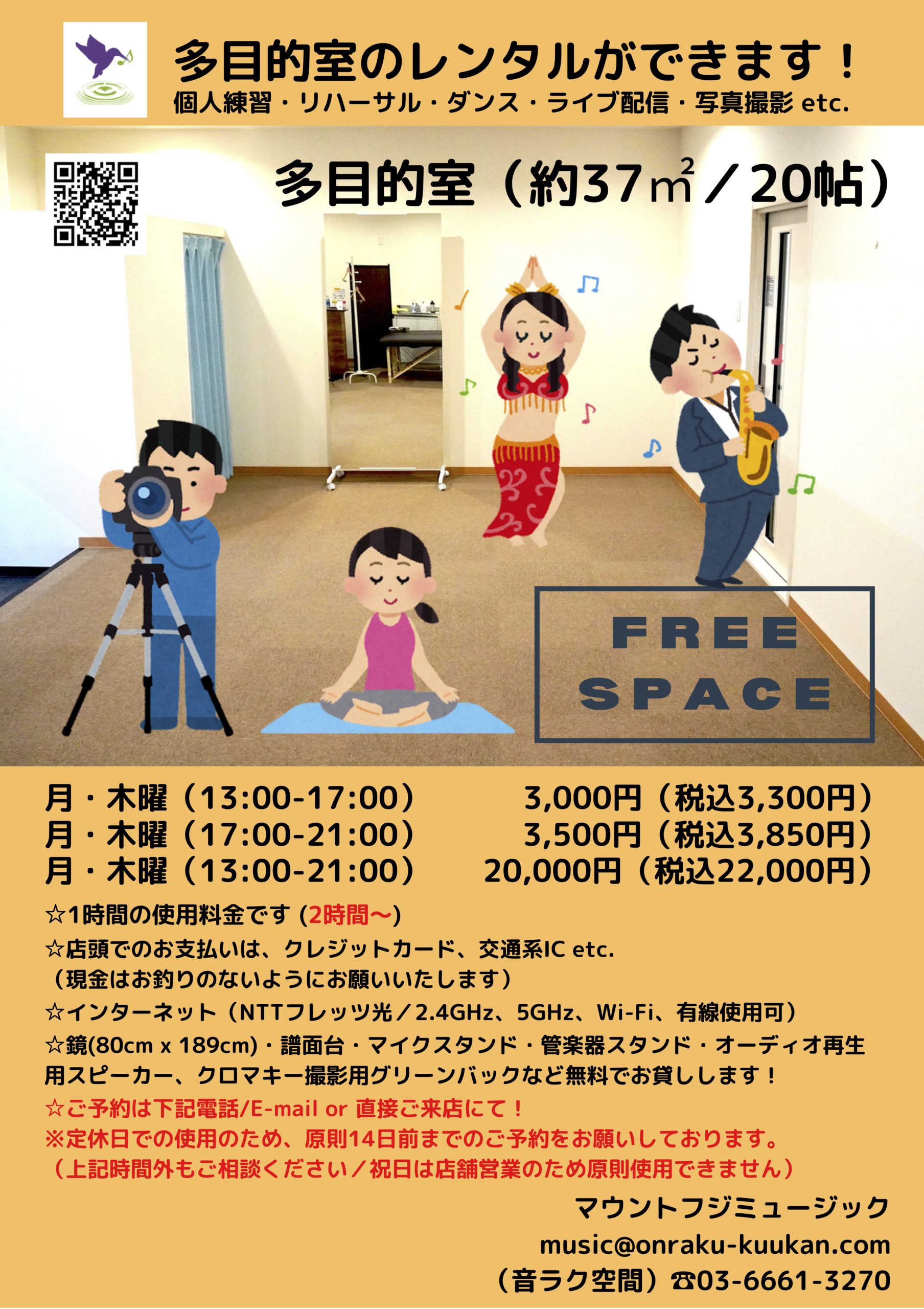 音ラク空間では、通常時、「マウントフジ・ミュージックスクール」(音楽教室)、「ストレッチ整体リ・カラダ(リラクゼーションサロン)として使用しているスペースを、教室の空き時間やサロンの休業日にレンタル出来ます。